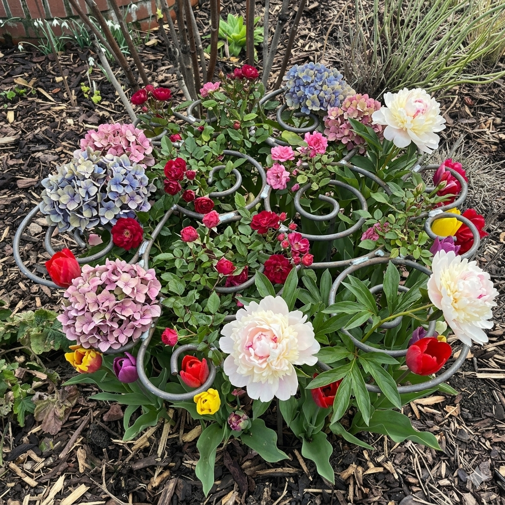 Place the frame around new shoots early in the season and guide growth from the very beginning. This is the easiest and most effective way to help your plants develop a full, natural shape without forcing or tying them later.